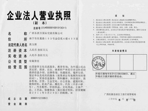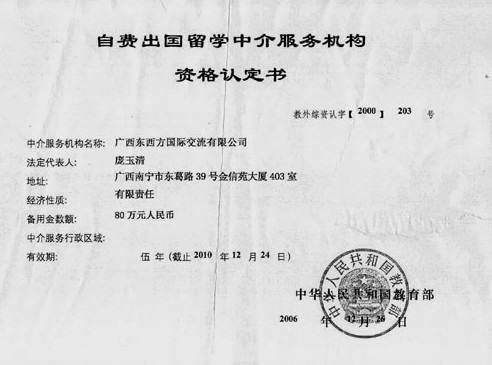广西东西方国际交流有限公司是广西唯一同时拥有“自费出国留学中介服务机构资格认定书”和“因私出入境中介服务机构经营许可证”的合法中介服务公司,公司成立于1993年。